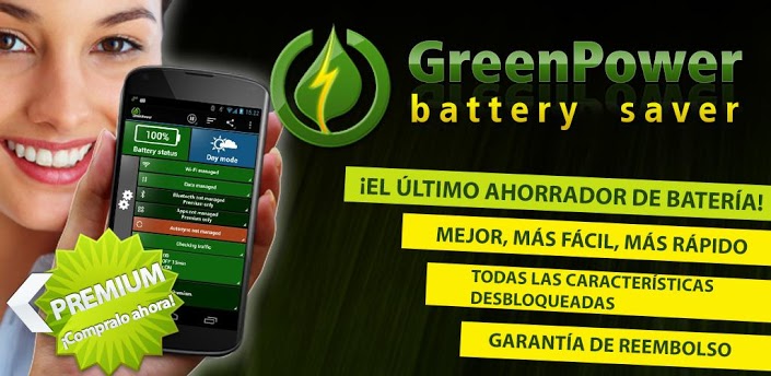 El ahorrador de batería GreenPower proporciona a tu batería muchas horas de vida adicionales "Carga menos veces tu batería ampliando su duración con esta fantástica aplicación" (Sprint newsletter, abril de 2012)