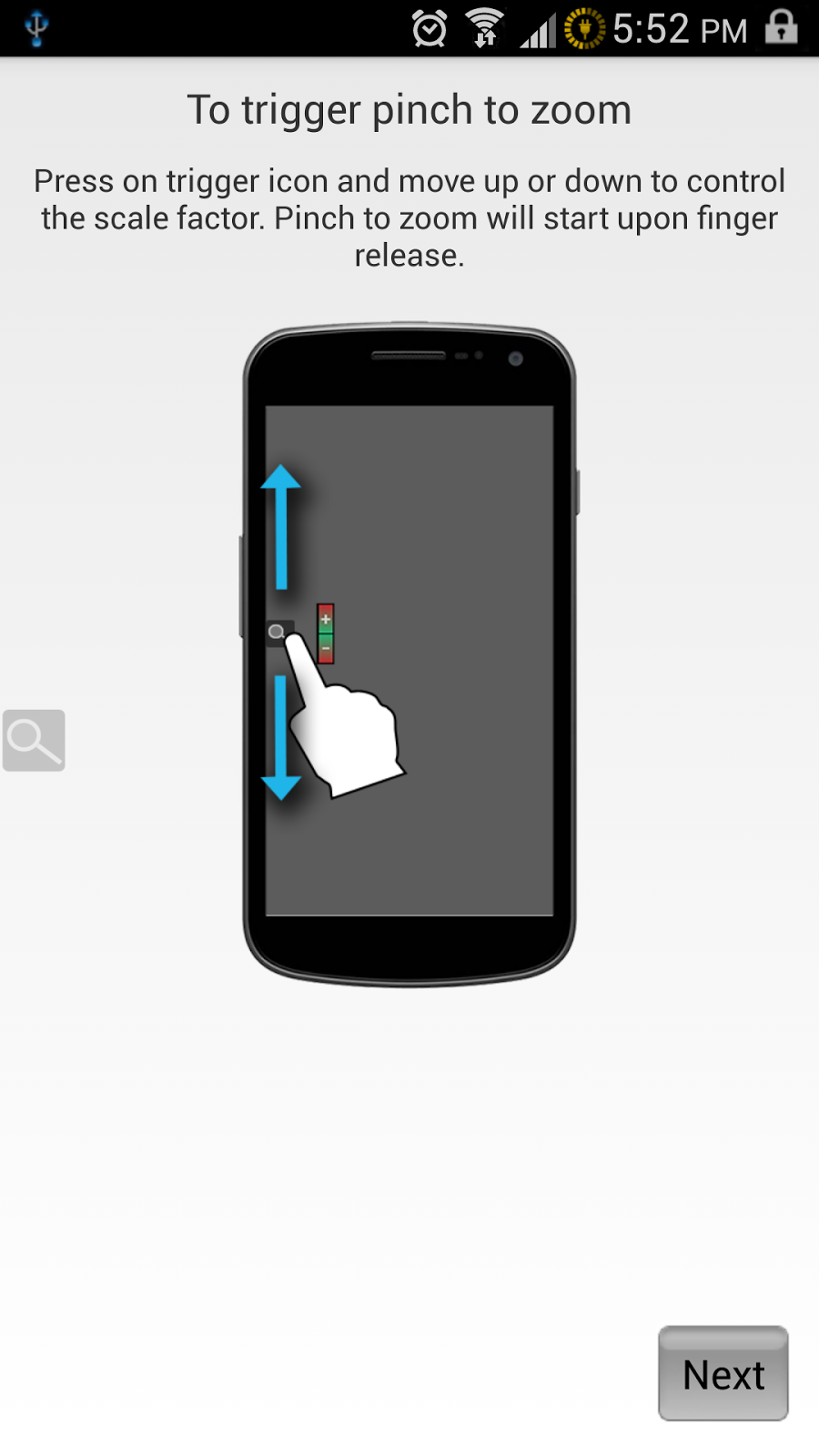 Assistive Zoom muestra un pequeño botón de zoom en el borde de la pantalla. Sólo tienes que pulsar sobre ella y mover hacia arriba / abajo para hacer zoom in / out a escala precisa según el movimiento que ha aplicado. Es así de fácil!