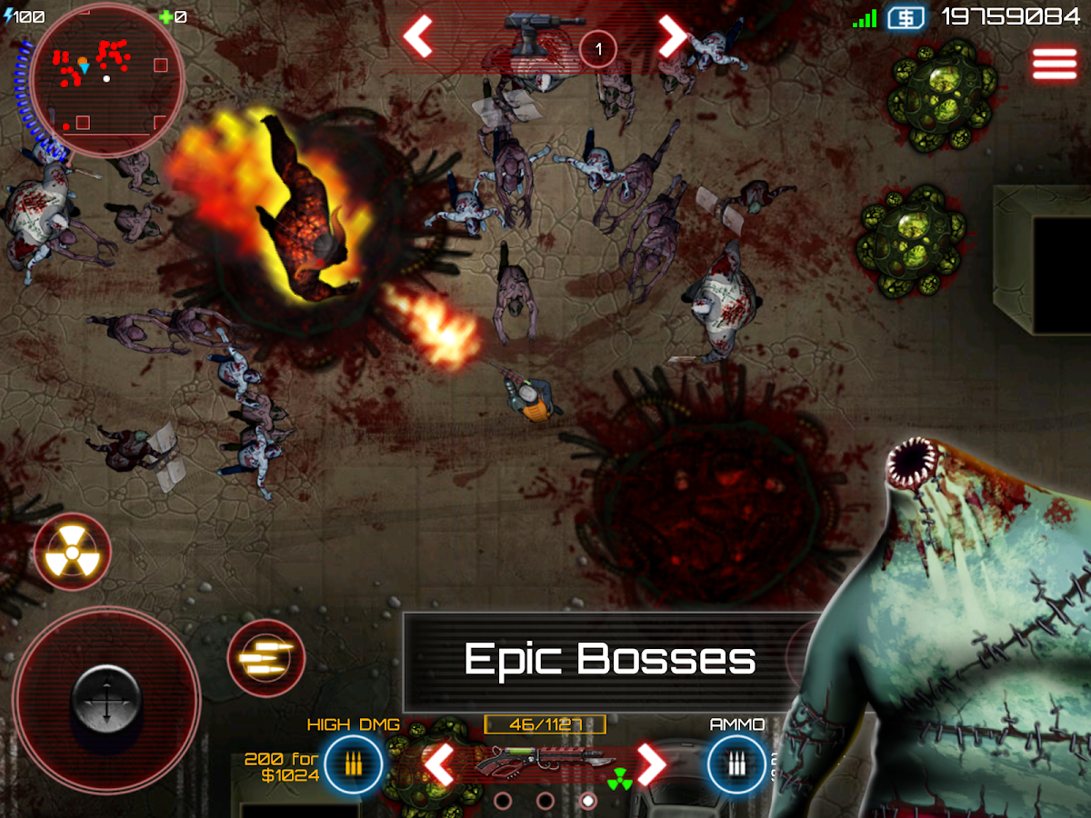 Zombies pululan la pantalla, explotando en pedazos bajo su lluvia de balas. Cada uno de los 17 tipos de zombies únicas tienen ataques y comportamientos especiales, y pueden evolucionar - manifestando nuevos poderes aterradores medida que progresas en el juego. Y justo cuando piensas que ya lo has vencer, zombies jefe salvajes que cazan, vomitando fuera gusanos ácidos o asalto después de que en el modo de rabia. Conozca sus fortalezas y debilidades y dirige a la acción a través de 7 mapas de historias impulsadas con diferentes condiciones de victoria.
