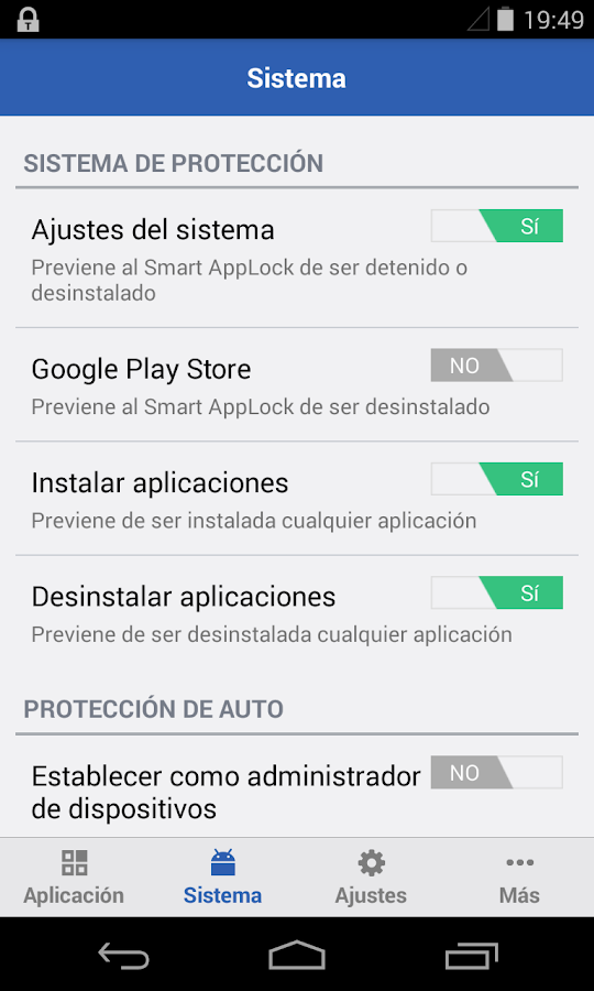 Esta programa se dise?a basado en el sistema inferior de Android, puede ayudarle proteger completamente para las aplicaciones que tienen datos privados. Después de iniciar la protección del Smart Applock, hay protección de bloqueo gráfico cuando hay alguien abriendo las aplicaciones protegidas.
